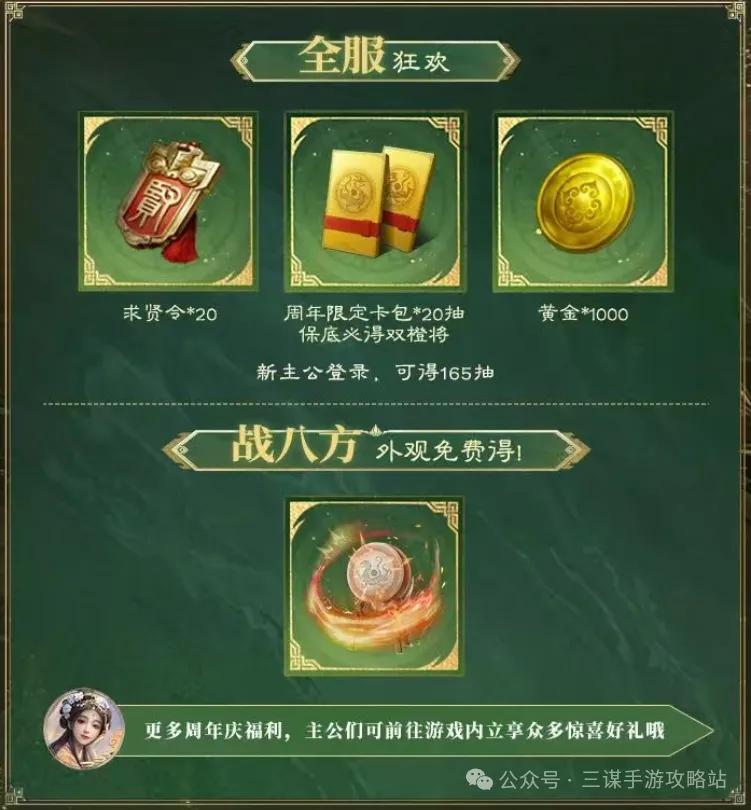 三国谋定天下即将迎来1周年生日,相关的活动也即将和大家见面,本次三谋周年庆系列活动,可以拆解为五大部分。相信大家也都比较关心会有哪些福利,那小编这就带各位先睹为快三国谋定天下1周年活动玩法奖励!