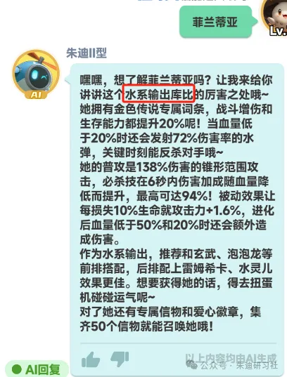 此外,在新增的朱迪AI中,向小机器人提问菲兰蒂亚,朱迪AI的回复的相关信息中,仍然是旧版本菲兰蒂亚。并且,朱迪AI是在二代水改版10天后才上线的,信息库应该早就进行了更新,怎么会现在还是旧版介绍呢?官方大大真的要抛弃咱们菲兰蒂亚了嘛?
