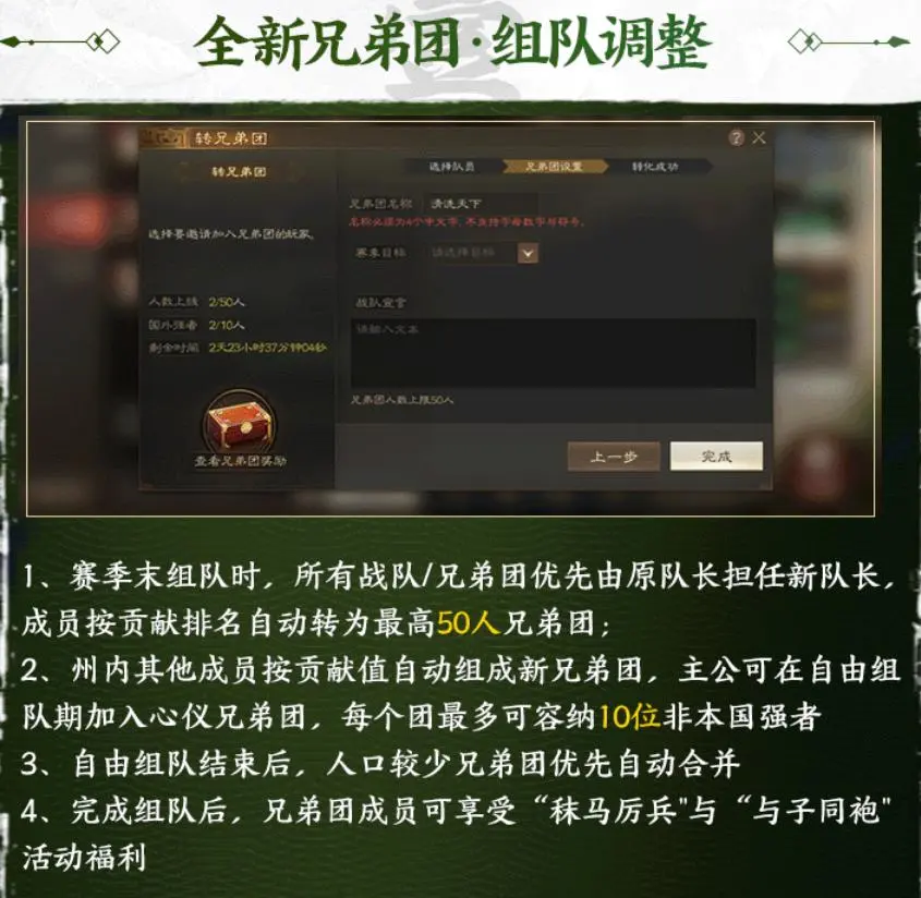 - 自由组队结束后,少于一定人数的【兄弟团】将可能与其他兄弟团自动合并