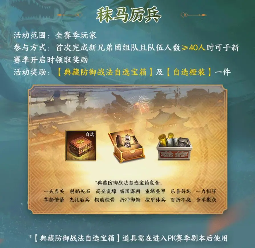 好处是首次完成新兄弟团组队且人数≥40人时,可于新赛季开启领取自选典藏防御战法和自选橙装一件。