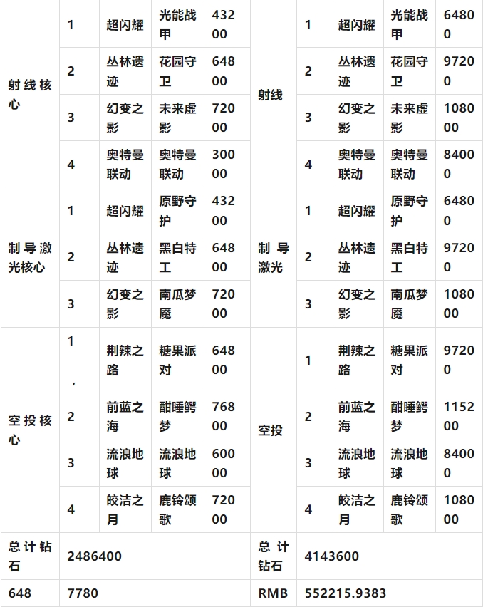 而且时装核心中也没有计算炫彩套装,其次每次活动的保底金额都不一样,有的贵有的低,而且还有提前出货的可能,所以都是取往期活动中的平均值进行计算。