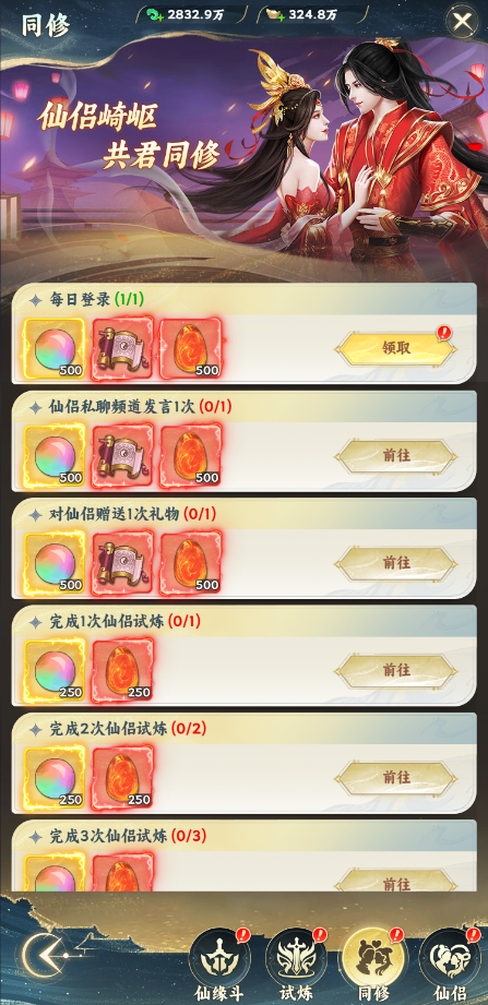 玩家结婚后,可以开启同修系统,完成同修任务可以获得奖励