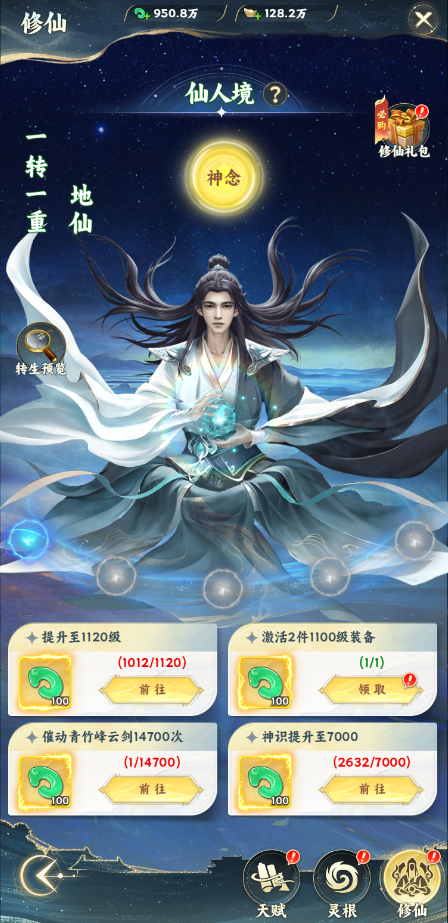 玩家完成修仙任务后可以领取任务奖励,全部任务完成后,点击破境按钮,可以提高转生重数,转生重数满后则提升转生等级。提升转生等级会大幅提升角色的属性,达到目标的转生等级后,还会开放神识,大幅度提升角色战力。