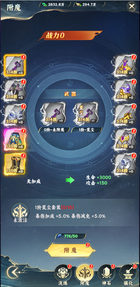 玩家可以通过消耗附魔石给装备附魔提升装备的属性,当全身装备附魔到指定等级时,会获得一个特殊效果的加成。使接下来的战斗更轻松。