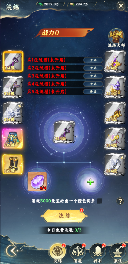 玩家达到一定的修仙等级后,可以解锁装备部位进行洗练,每个部位最多可开启5个,每个槽可洗练出一条属性,词条属性分为蓝、紫、橙、红、金,品质越高越接近词条属性的最大值。