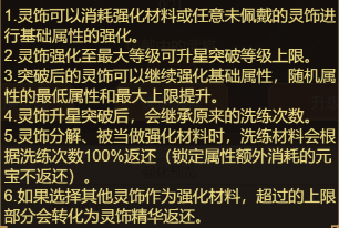 5. 灵饰分解、被当做强化材料时,洗练材料会根据洗练次数100%返还 (锁定属性额外消耗的元宝不返还)。