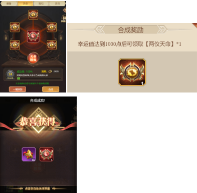 4.合成几率为放入天命数量而定,失败后参与合成的天命将根据品阶被分解为数量不等的天命粉尘,并获得幸运值,一个天命为20%成功率,五个为100%。