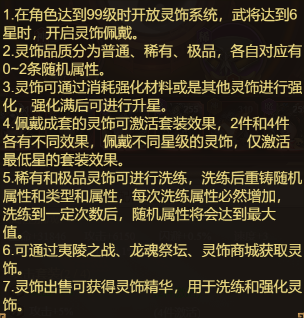 1. 在角色达到99级时开放灵饰系统,武将达到6星时,开启灵饰佩戴。