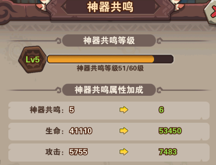 神器可通过强化提升等级,这边建议是要平均升每一个神器的等级,有共鸣等级属性加成的,而且也能增加每一个神器的属性伤害。
