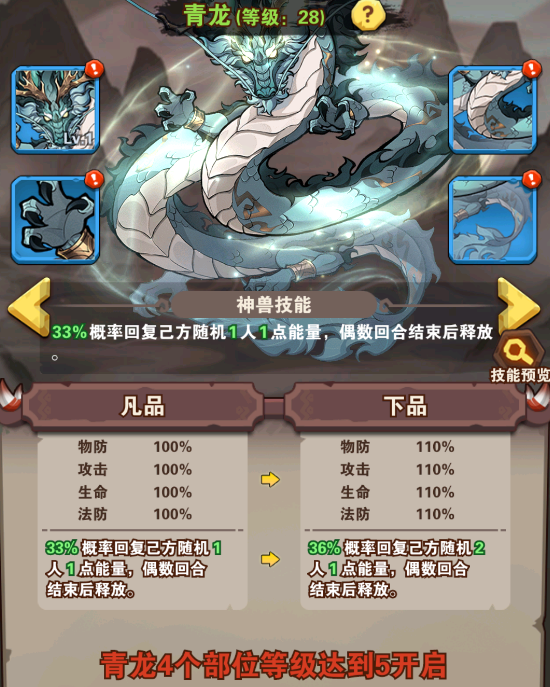 每种神兽都有他的技能,分别对应着青龙—回能、白虎—加攻、朱雀—回血、玄武—加防,由于布阵只能上一个神兽,这边建议优先升级青龙或者白虎
