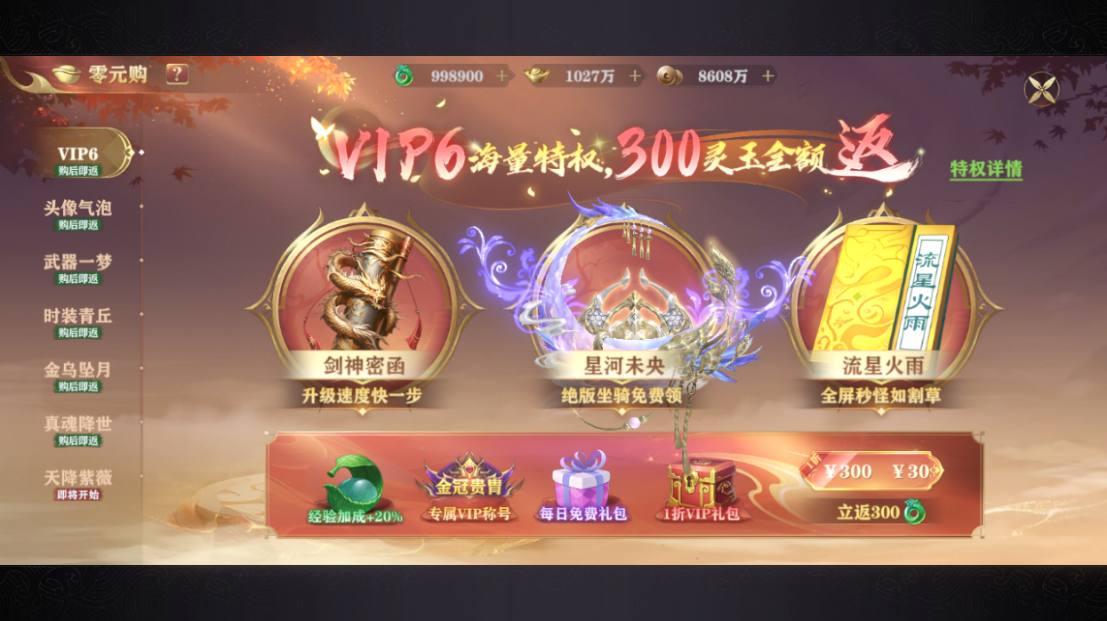 4.0元购30的特权可以直升v6性价比很高;v6原价需要1500元