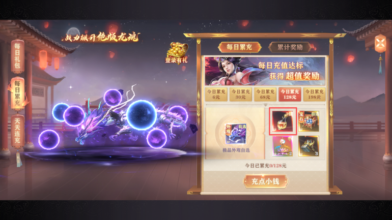 想长玩的,每日6元是必充的拿个倚天剑,前期战力膨胀得较快
