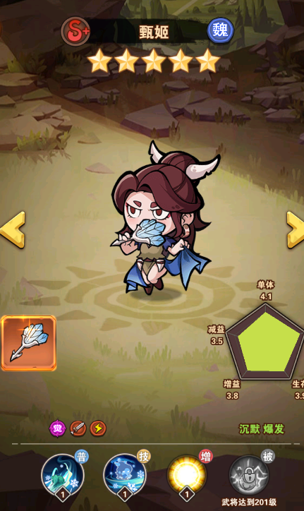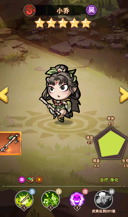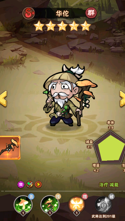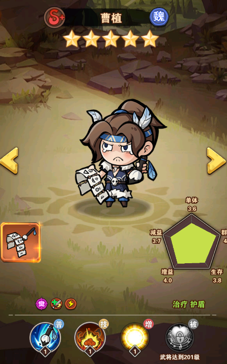 技能:全体恢复生命并提升防御(恢复生命石根据自身攻击力结算的,所以攻击力叠高),