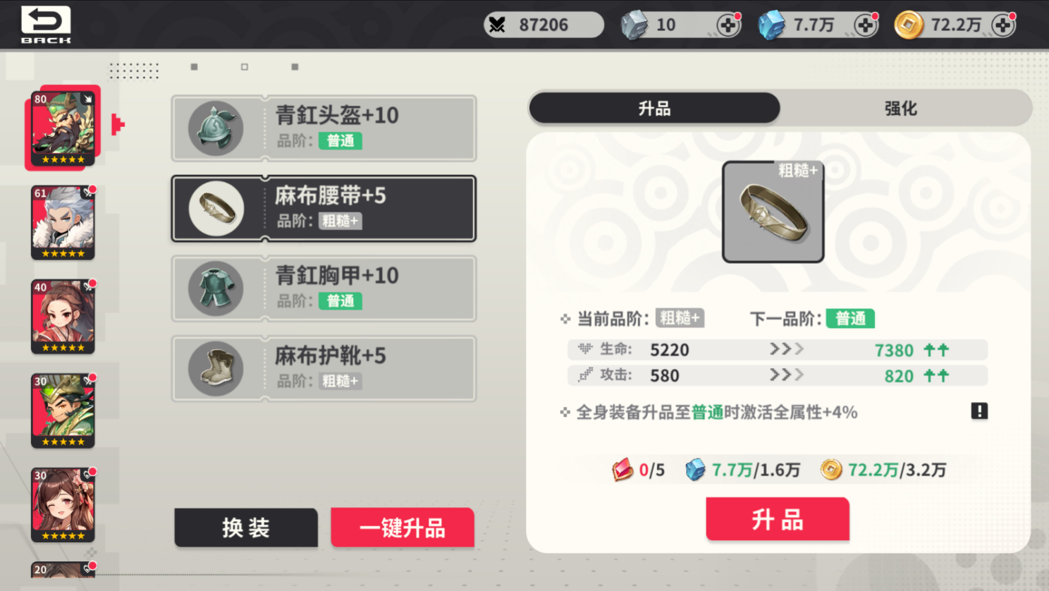 玩家可以通过挂机、古城商店购买等方式获得装备,装备可以进行强化,提升属性。同时,凑齐同品质的装备还可以触发套装效果